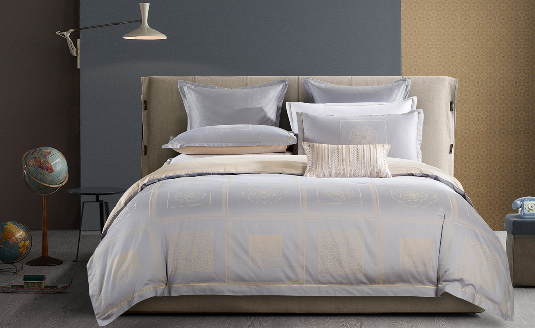 《都市印象》設計說明:鳥瞰下的城市縮影,藝術都市的一抹印象,有未來、有現代、有歷史,靜謐灰搭配鈦鈷金,輕奢時尚,都市創意靈感,點、線、面搭配,產品設計方圓結合,具有美好的寓意和濃厚的藝術氣息。“柔膚巢”工藝,合理的經緯密配比,考究的柔膚巢大小,特殊組織邊松內緊,形成了四周高、中間凹的立體布面效果 ,產品立體層疊、色澤生動,其獨特的立體結構,使面料間形成多個獨立的小空間,有利于空氣的流通與交換,達到吸濕透氣的目的,保證了皮膚表面的干爽舒適,經緯向立體圖案,可以掩蓋細小褶皺,更易打理,細膩的結構和波光粼粼的光影效果,讓產品更具檔次感。
